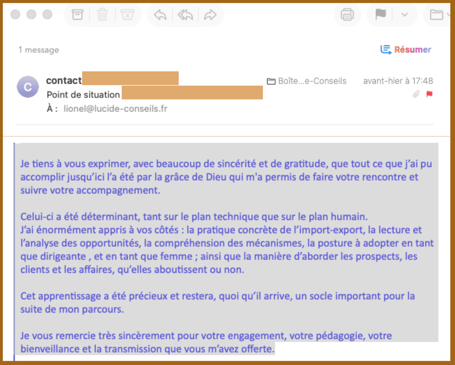 Il vient d’une ancienne cliente, accompagnée lors de la session de l’an dernier.